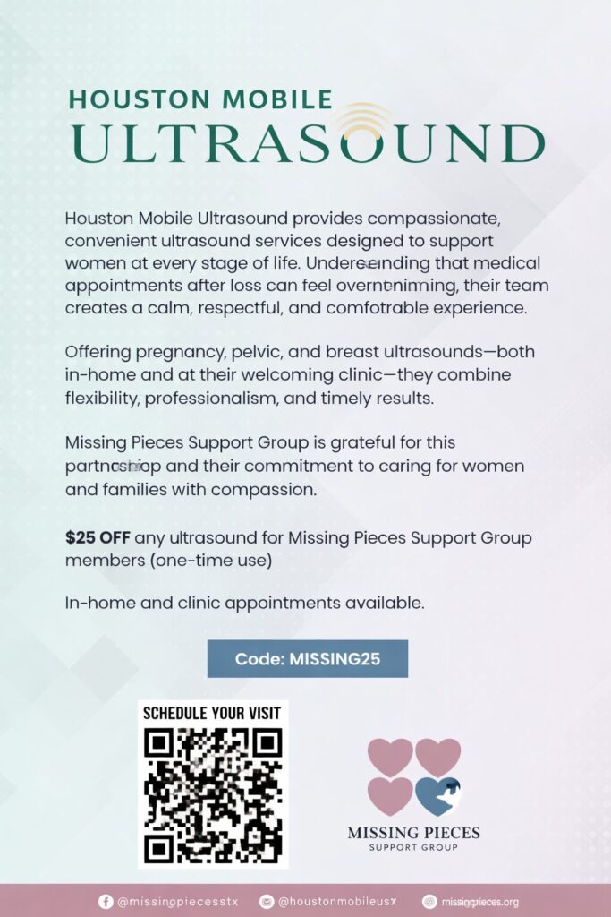 Through their partnership with Missing Pieces Support Group, Houston Mobile Ultrasound extends their care beyond imaging by supporting families within our community with empathy and understanding. They help ensure that women receiving services after loss are met with a gentle, patient-centered approach and are aware of the emotional support resources available to them.